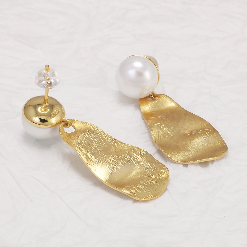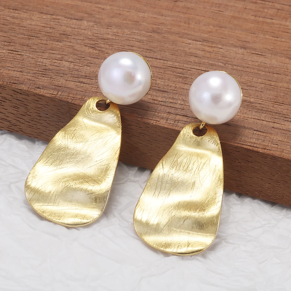 925 Sterling Silver Water Drop Earrings with Natural Pearl Gold Plating Vintage Scratch Wave Pattern Elegant Female Jewelry