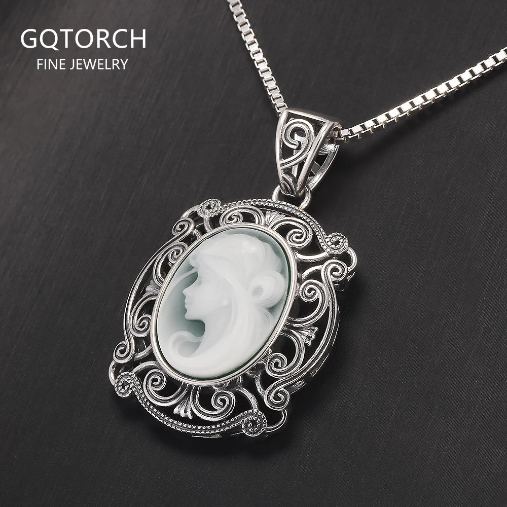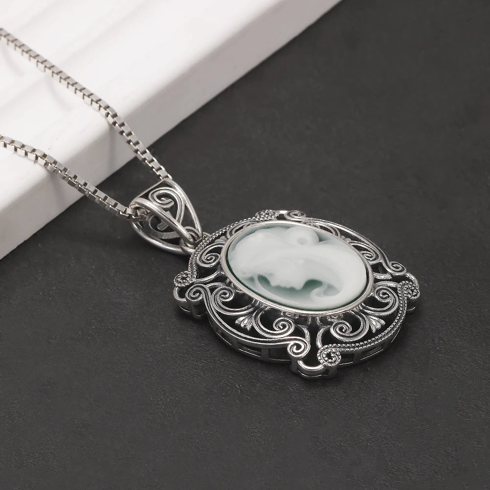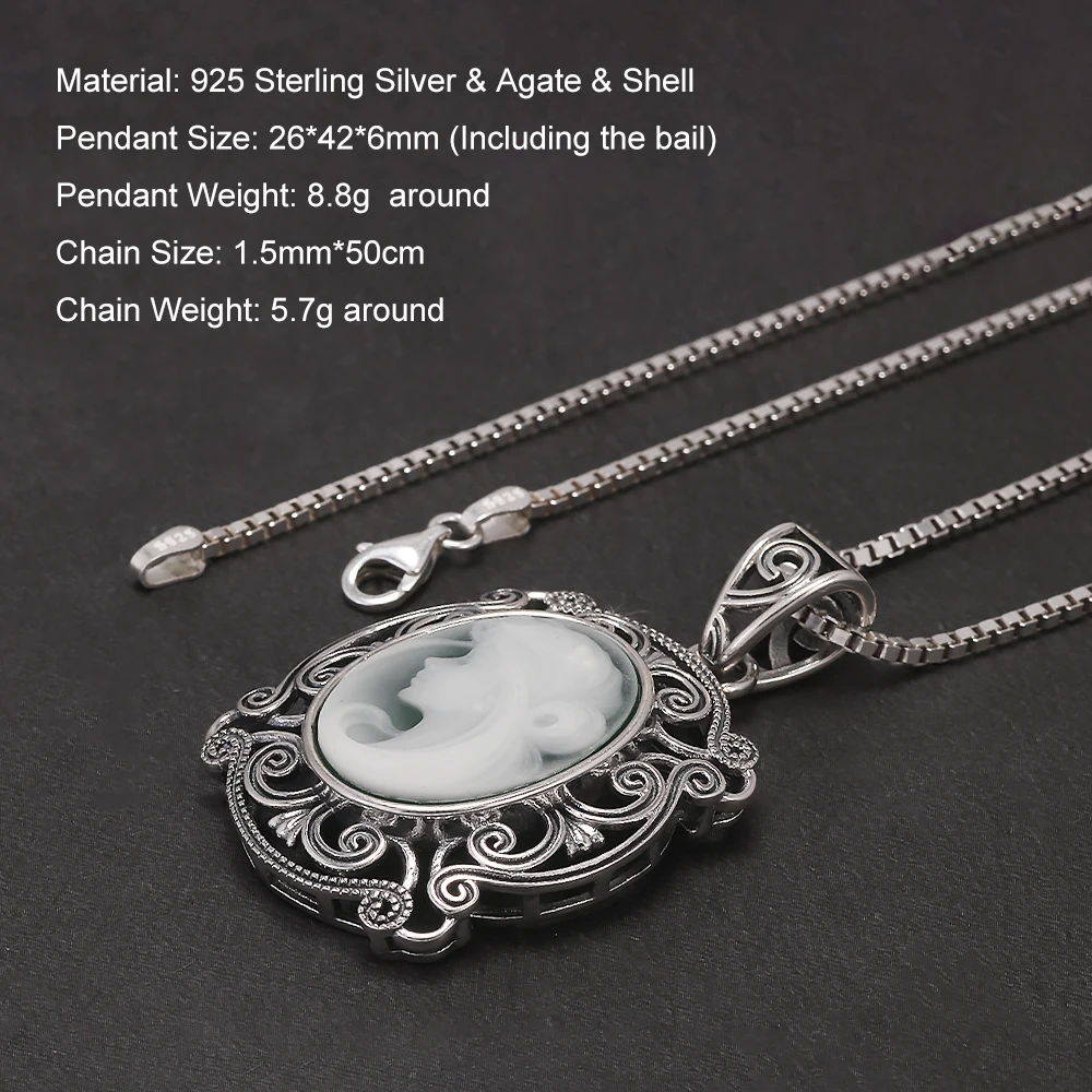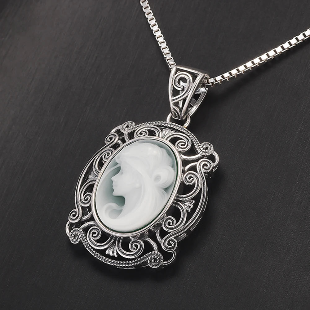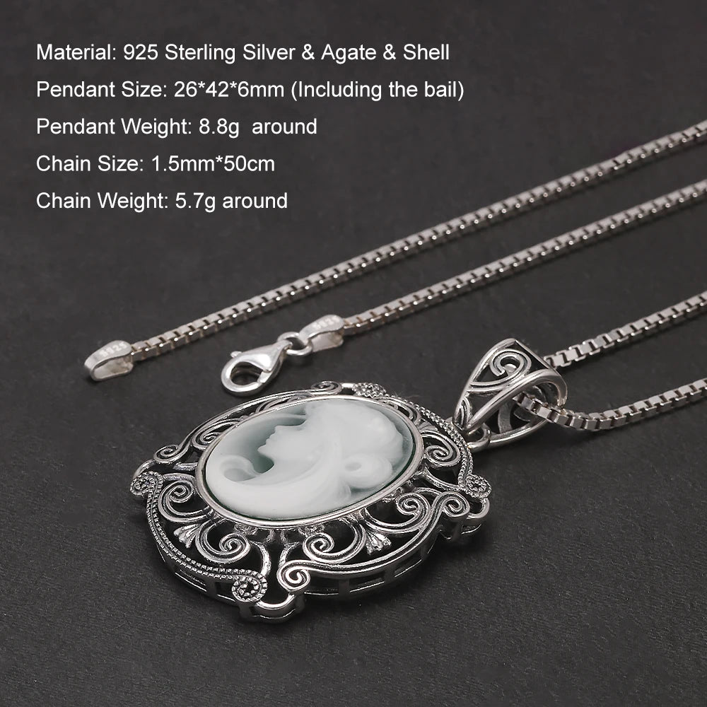 925 Sterling Silver Cameo Goddess Necklace for Women Green Agate Big Pendant White Shell Engraved Vintage Antiqued Jewelry
