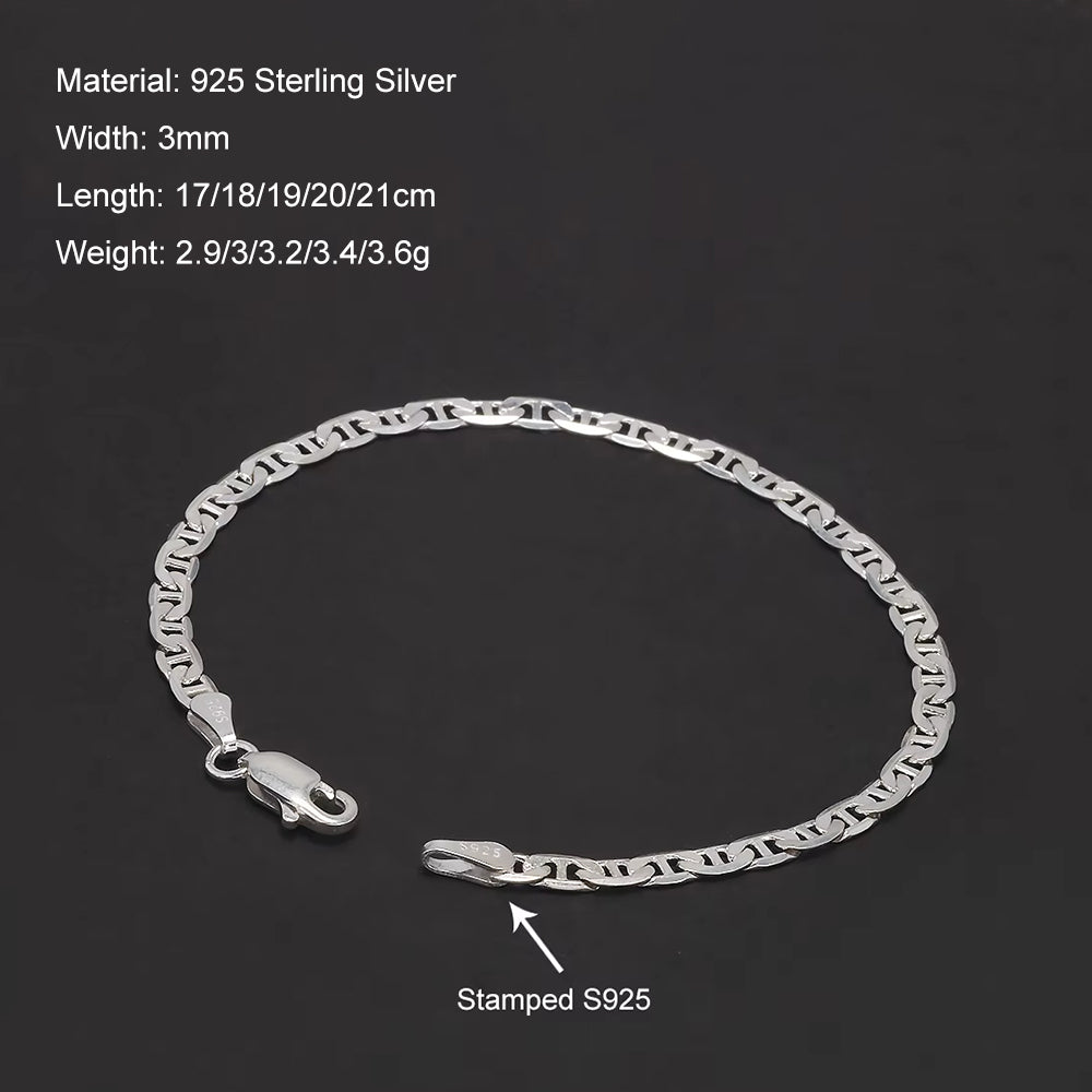 925 Sterling Silver Flat Mariner Chain Bracelet for Men Women 3mm Thin Bracelet Simple Classic Trendy Party Jewelry Gift