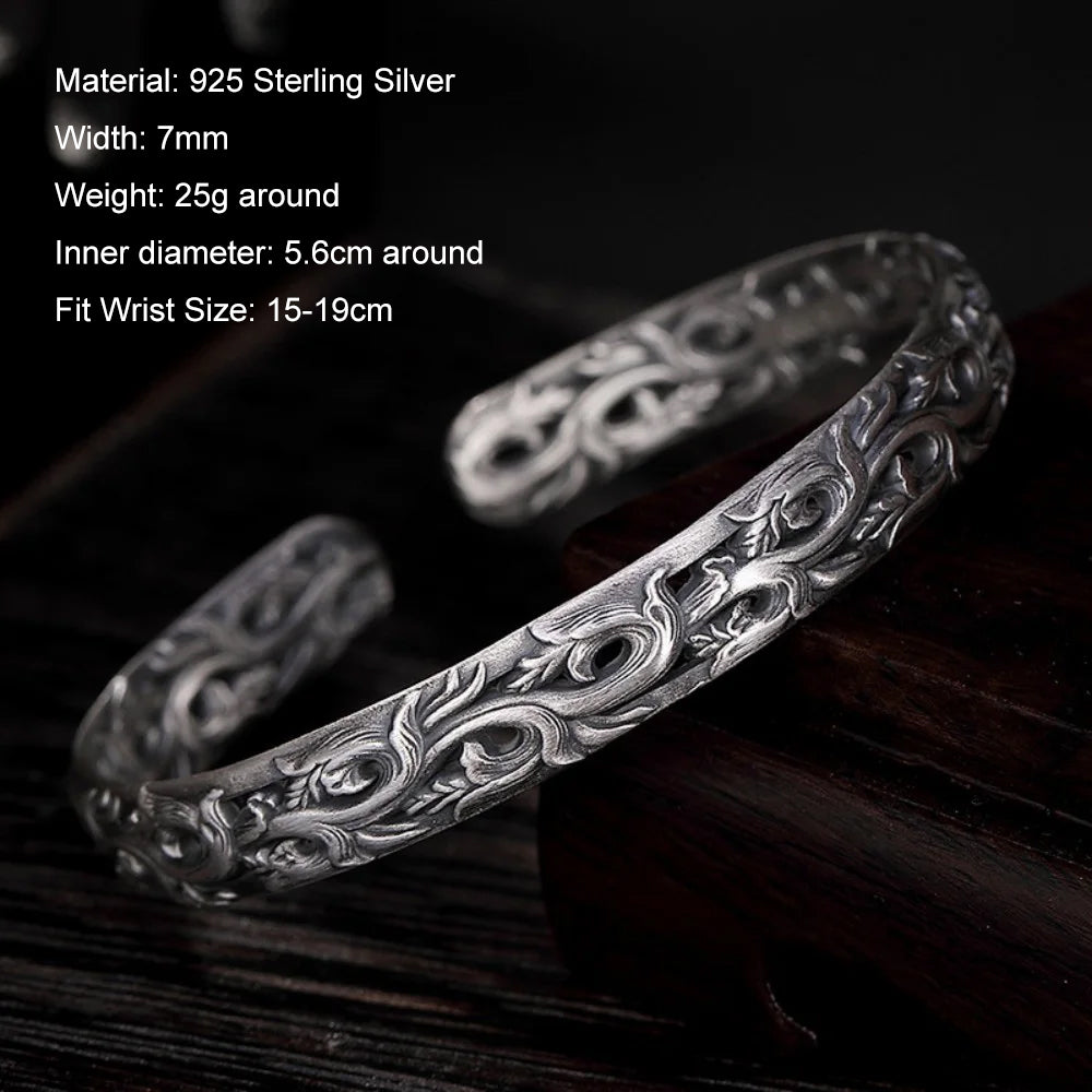 S925 Sterling Silver Bracelet for Women Retro Antique Vine Flower Pattern Engraved Ethnic Bangles for Women Thai Silver Jewelry