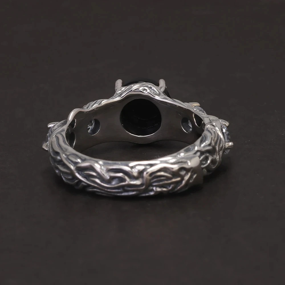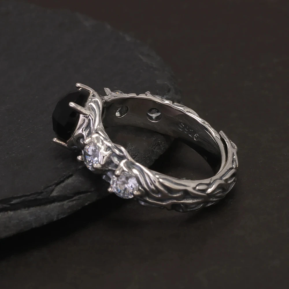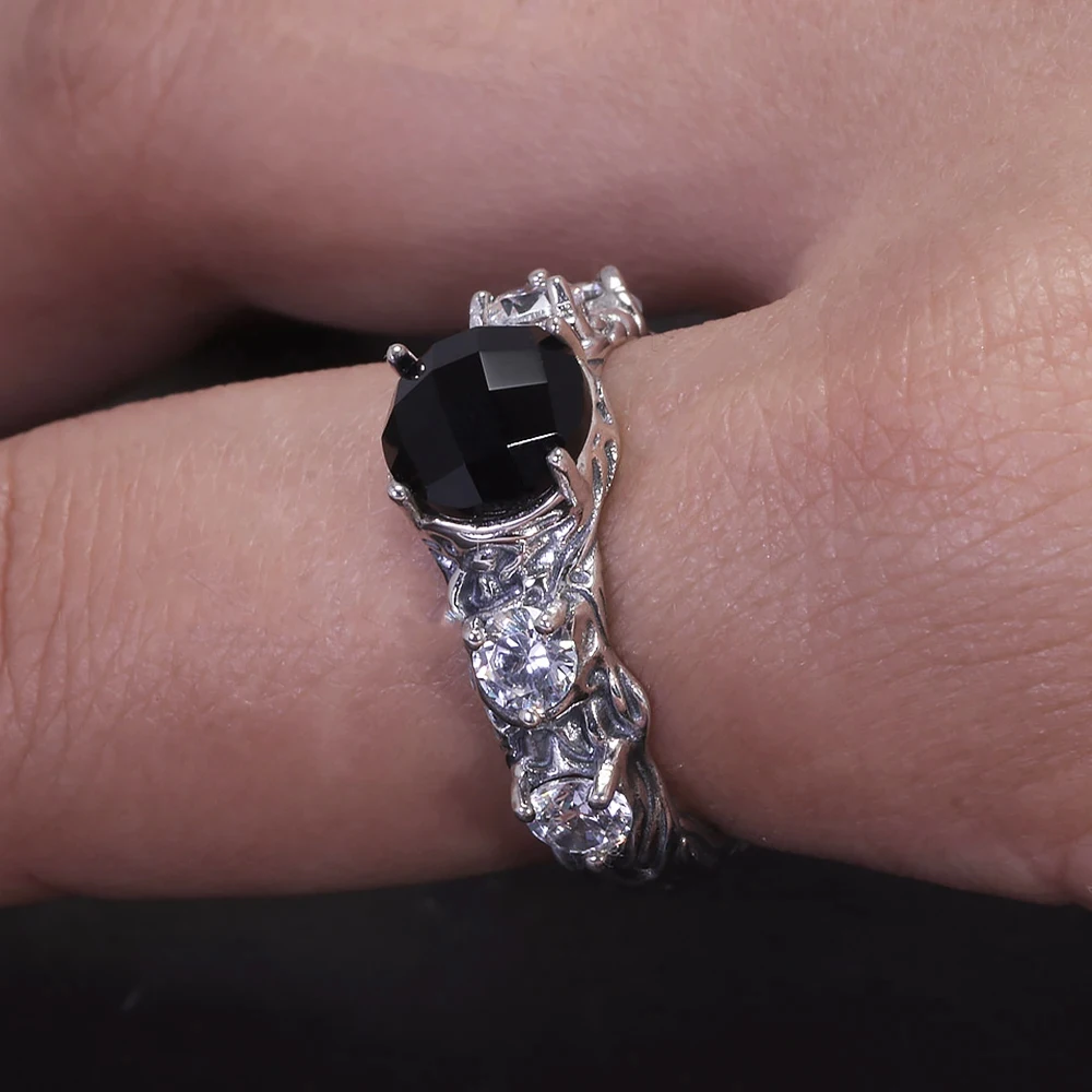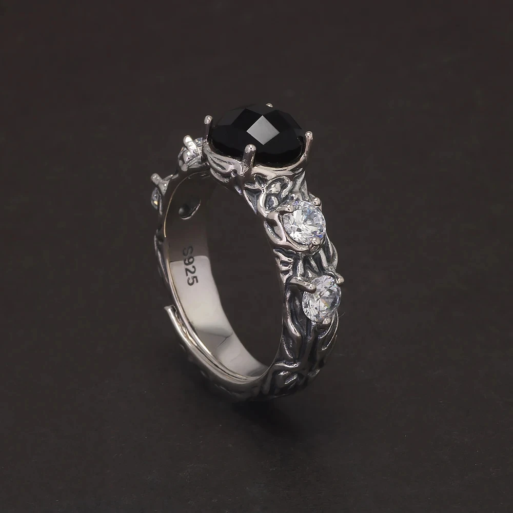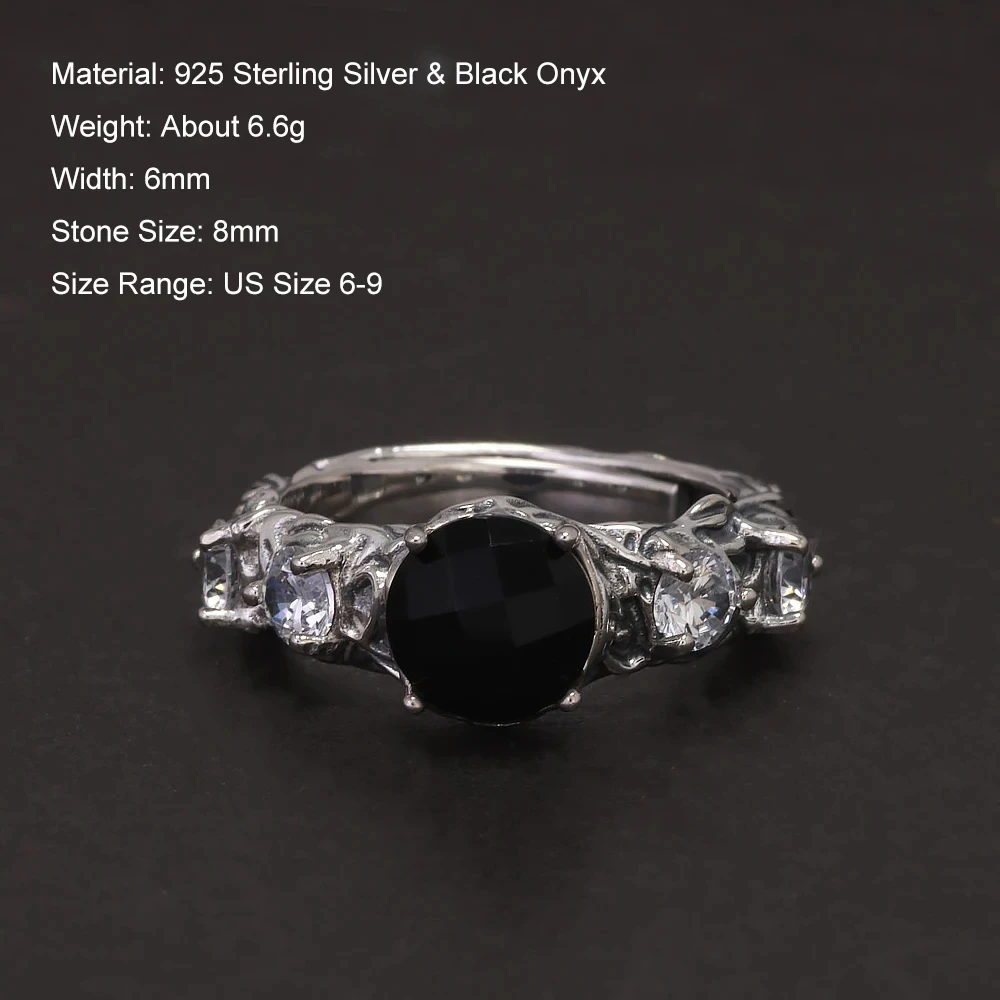 Vintage Round Black Onyx Engagement Ring for Women 925 Sterling Silver Natural Onyx Stone Zircon Adjustable High Quality Jewelry