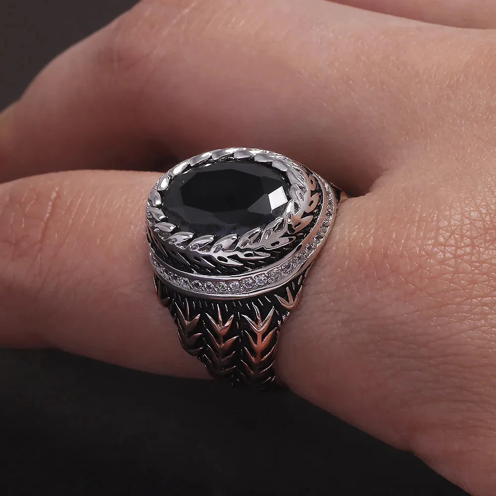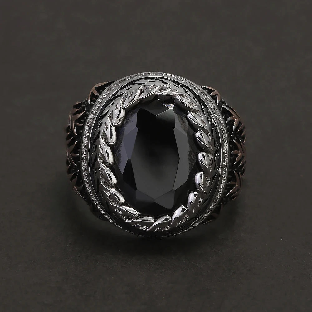 925 Sterling Silver Black Onyx Signet Ring for Men Wheat Engraved Oval Shaped Vintage Turkish Rings Male Jewelry Gift