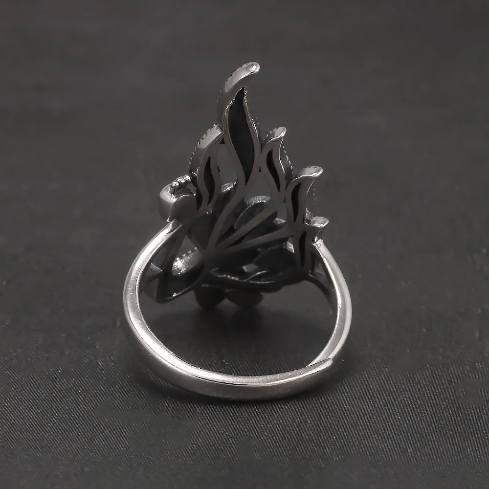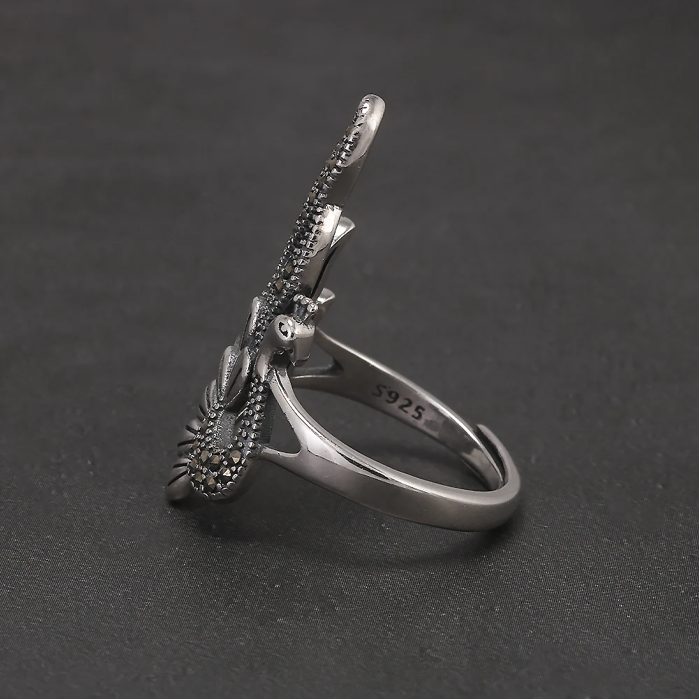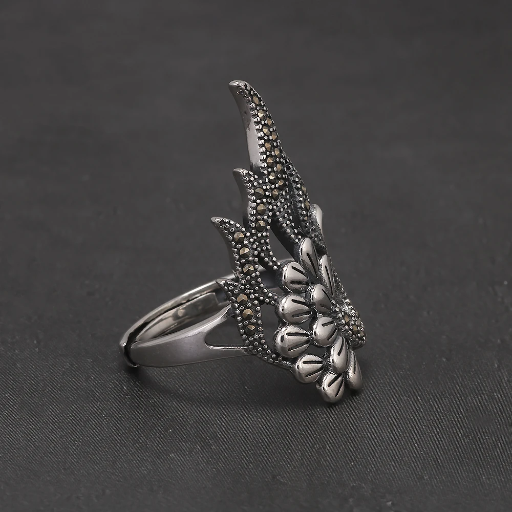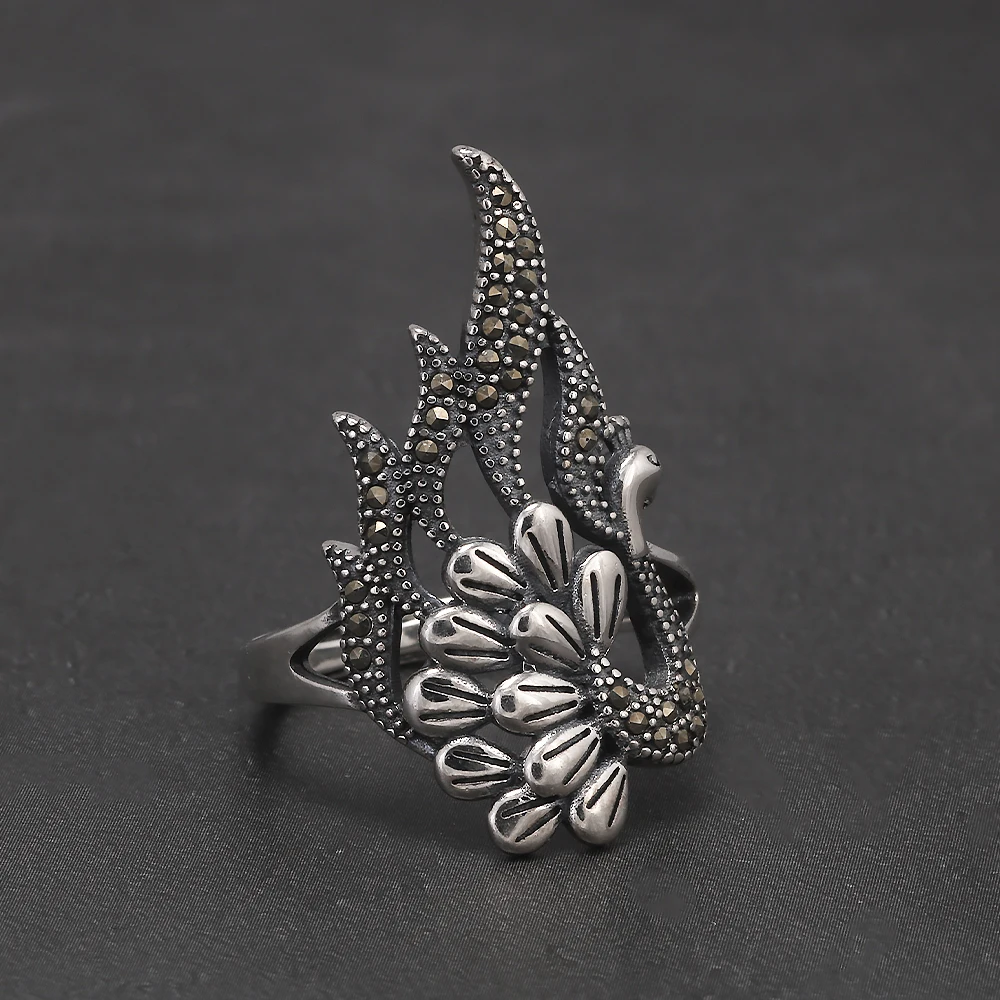 925 Sterling Silver Vintage Peacock Ring for Women Micro Inlaid Hematite Ethnic Style Party Jewelry Gift for Lady Mom