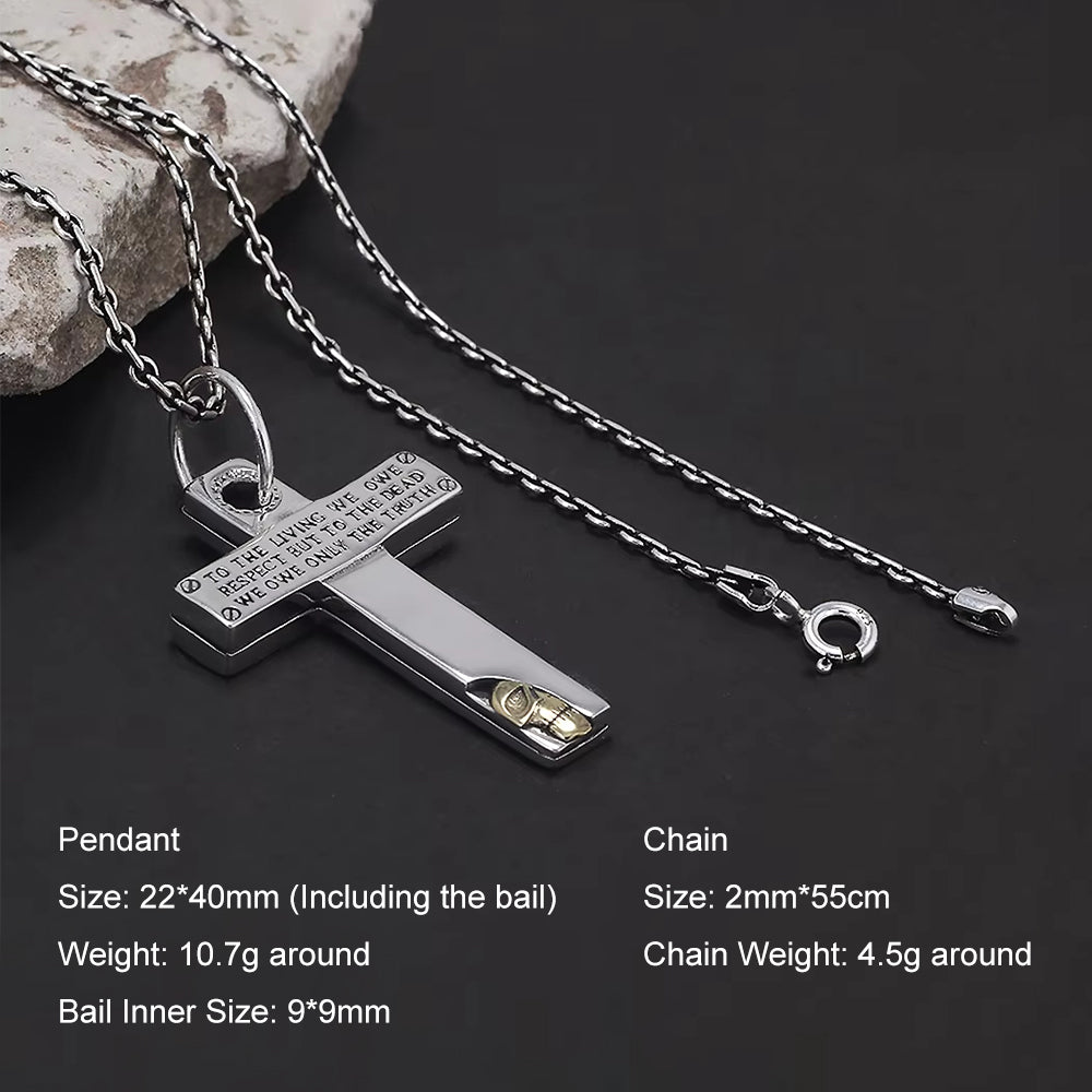 925 Sterling Silver Cross Pendant Necklace Skull Link Chain Respect & Truth Voltaire Quote Necklace Punk Retro Hip Hop Jewelry