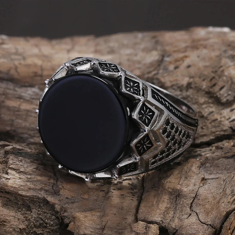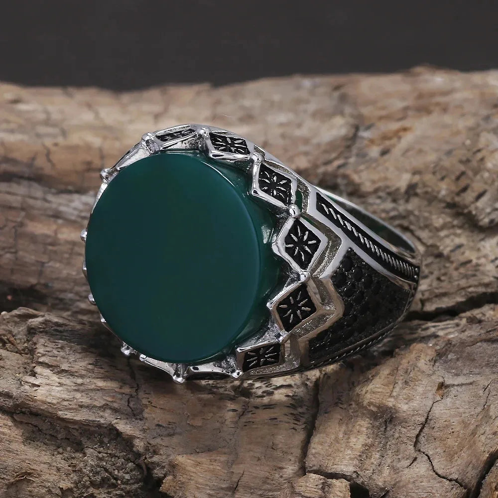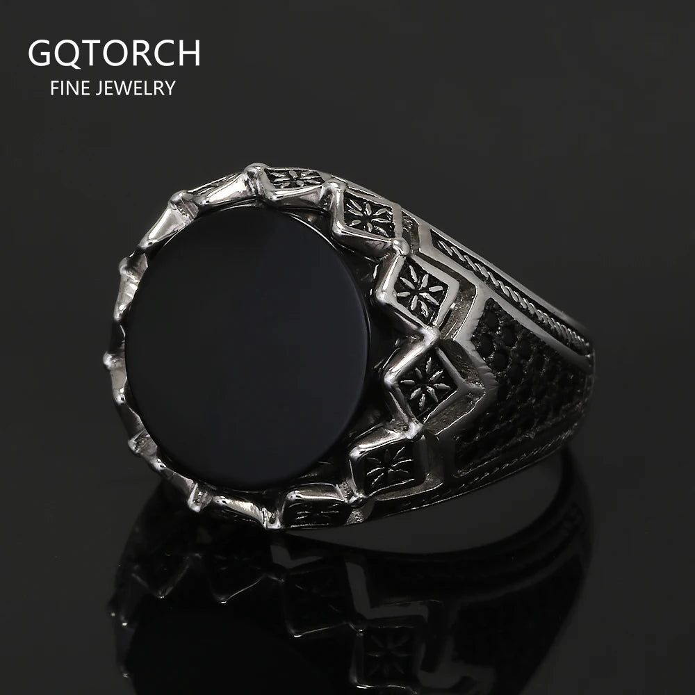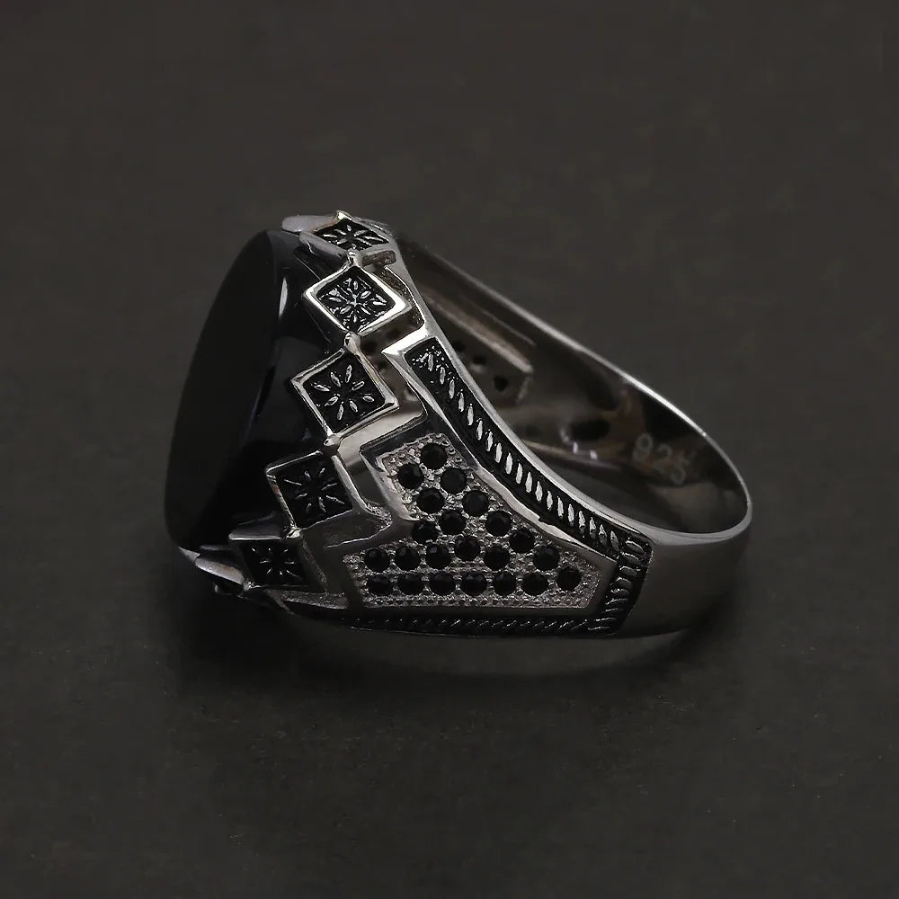 925 Sterling Silver Black Stone Onyx Signet Ring for Men Micro Inlaid Zircon Red Green Agate Ring Luxury Vintage Turkey Jewelry