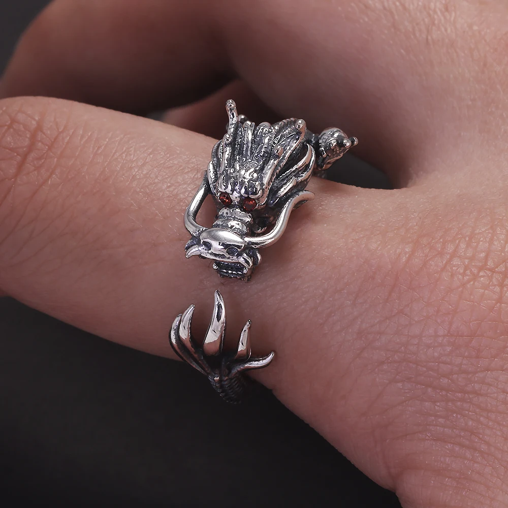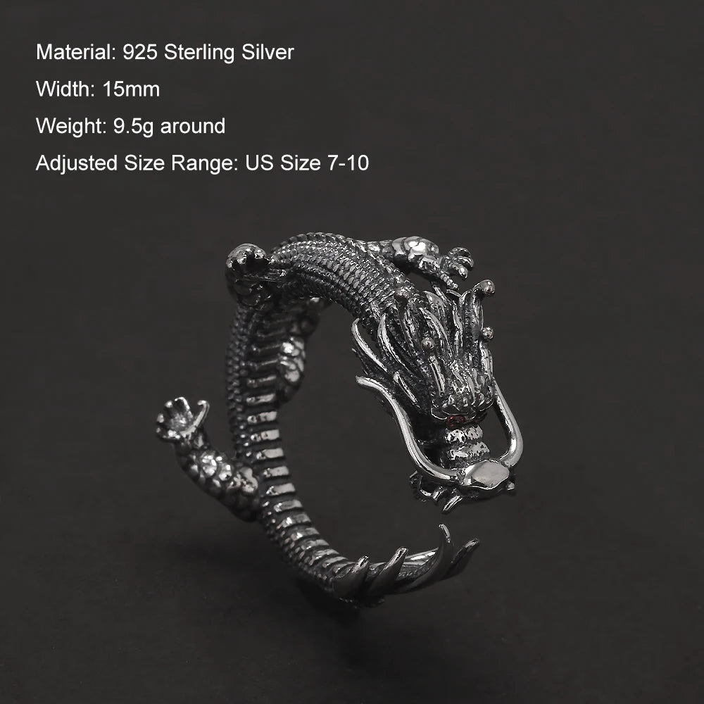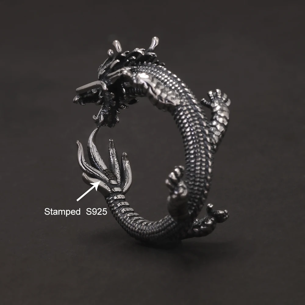 Genuine 925 Sterling Silver Punk Dragon Open Ring for Men Adjustable Retro Vintage Thai Silver Fashion Gothic Animal Jewelry