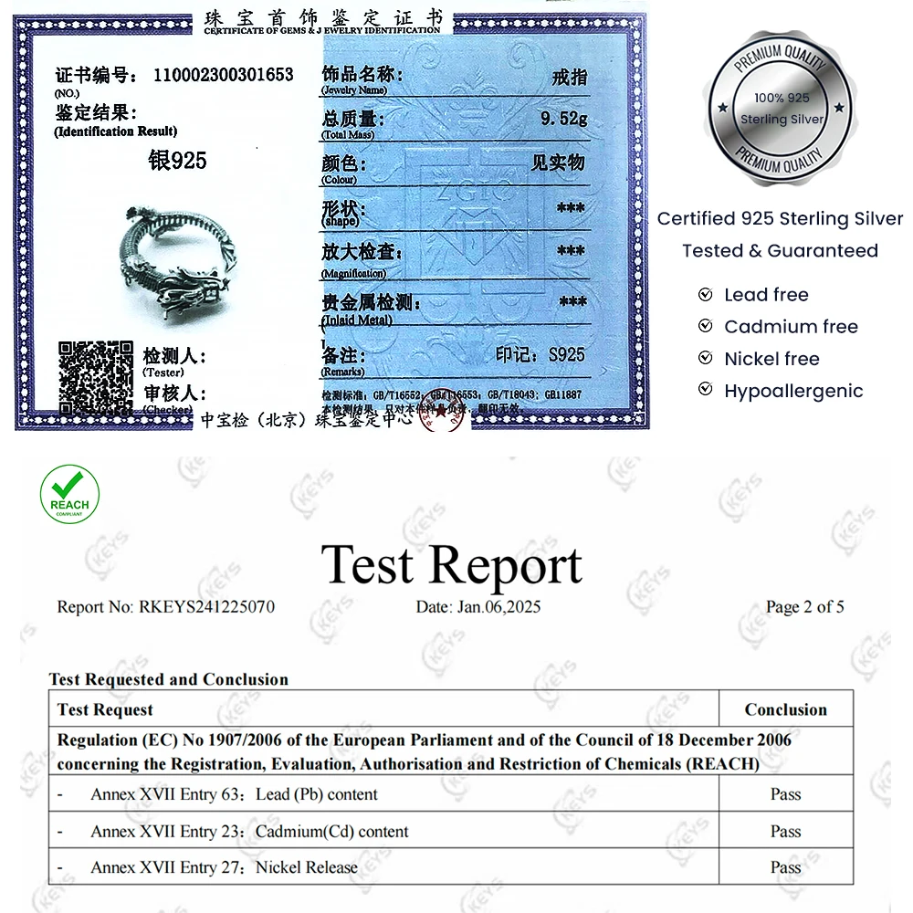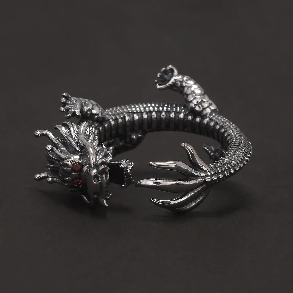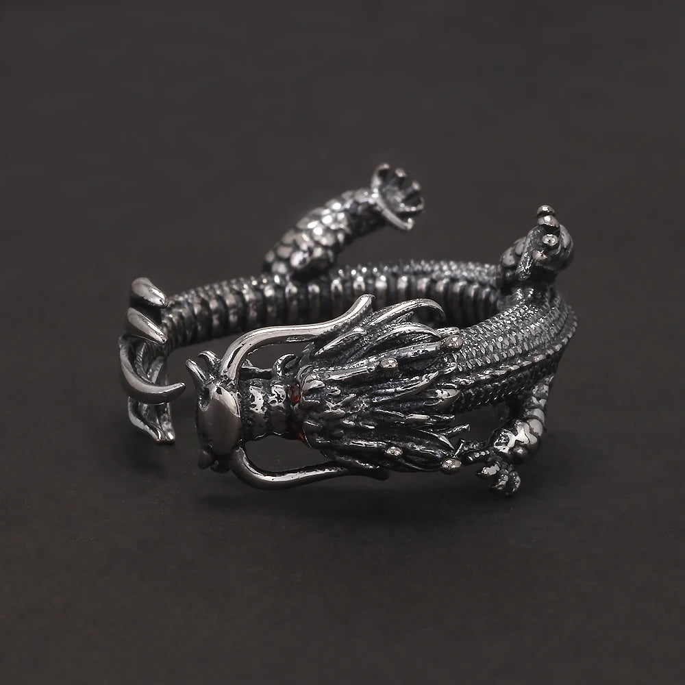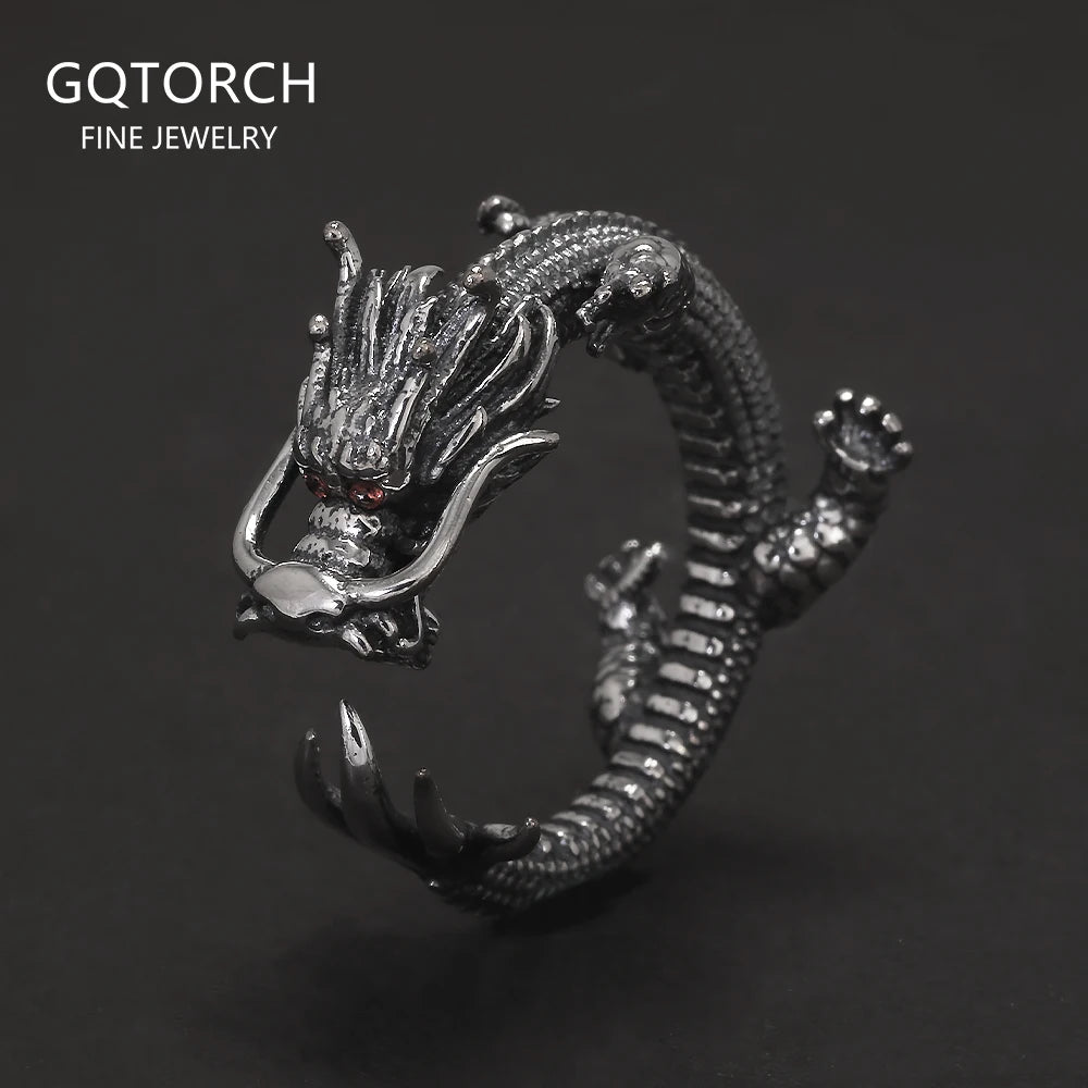 Genuine 925 Sterling Silver Punk Dragon Open Ring for Men Adjustable Retro Vintage Thai Silver Fashion Gothic Animal Jewelry
