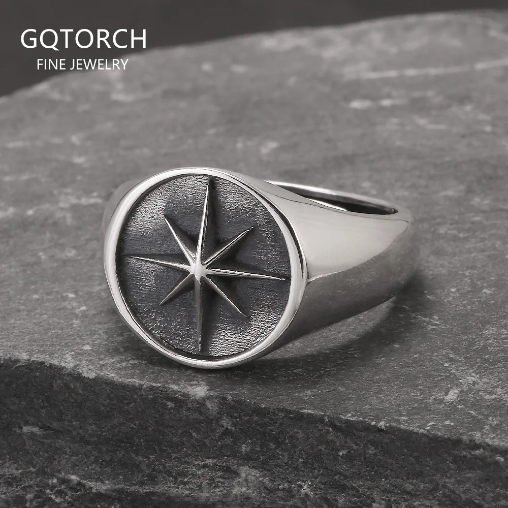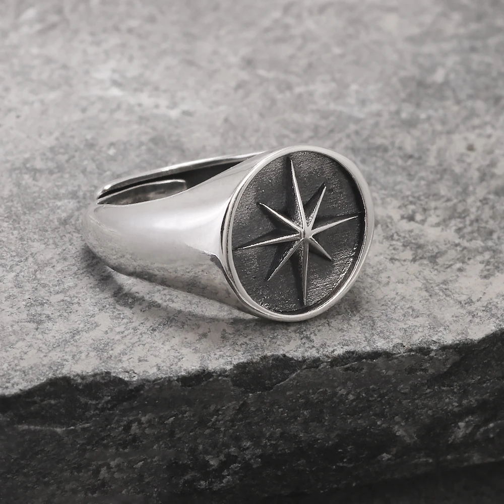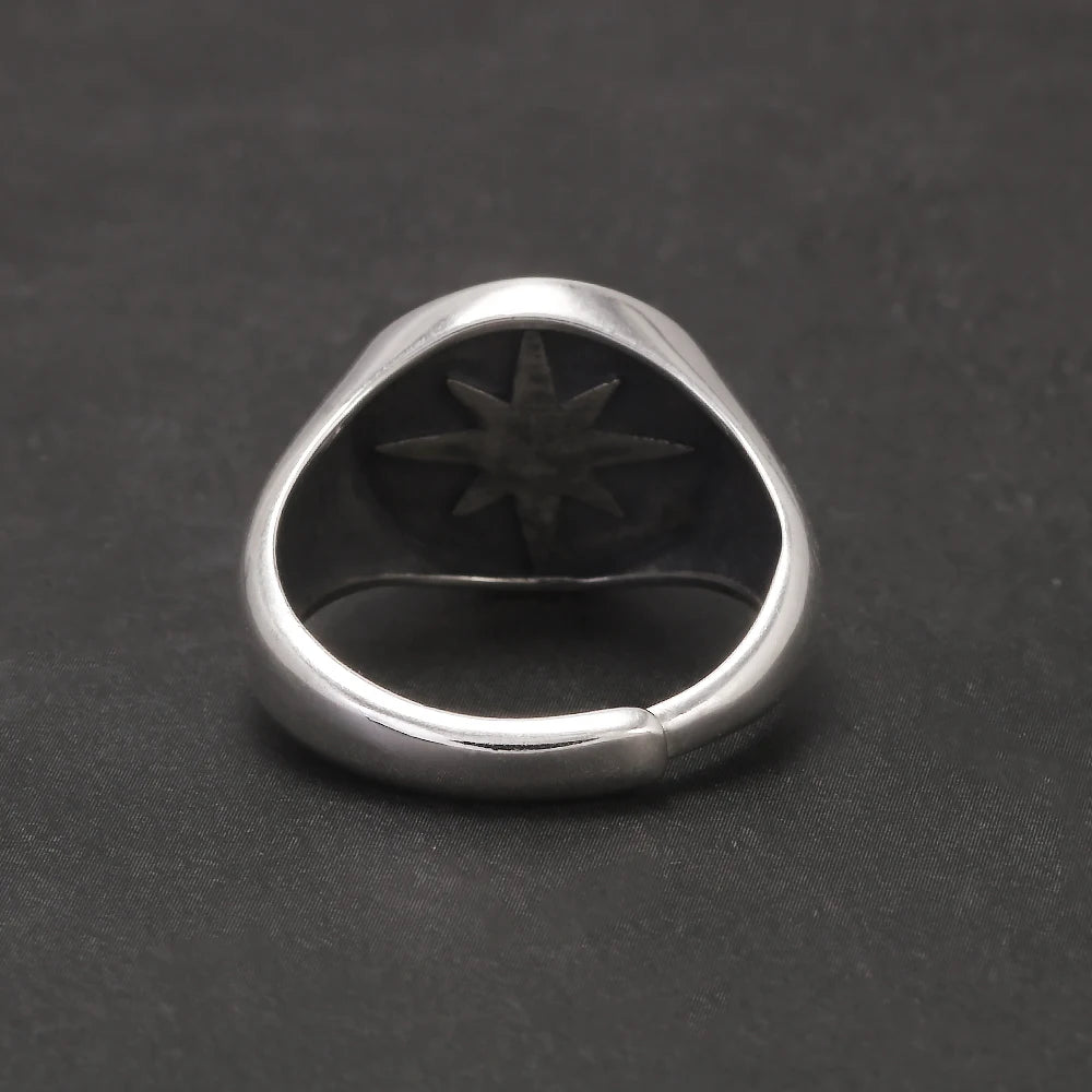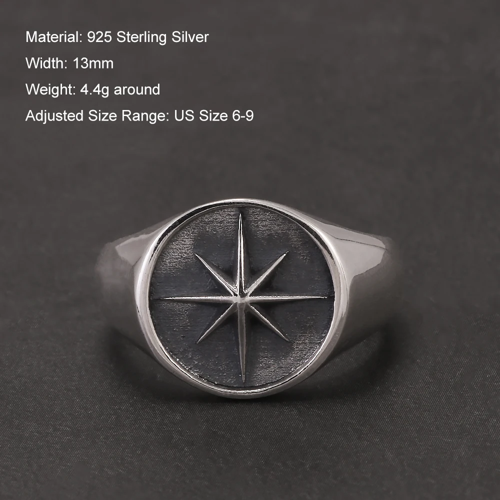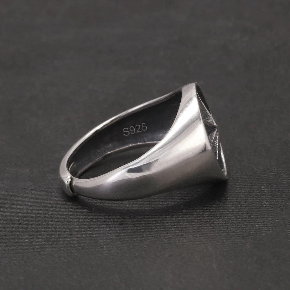 Solid 925 Sterling Silver Eight Point Star Signet Ring for Men Octagram Open Ring Adjustable Punk Retro Antiqued Biker Jewelry