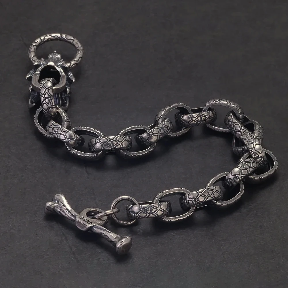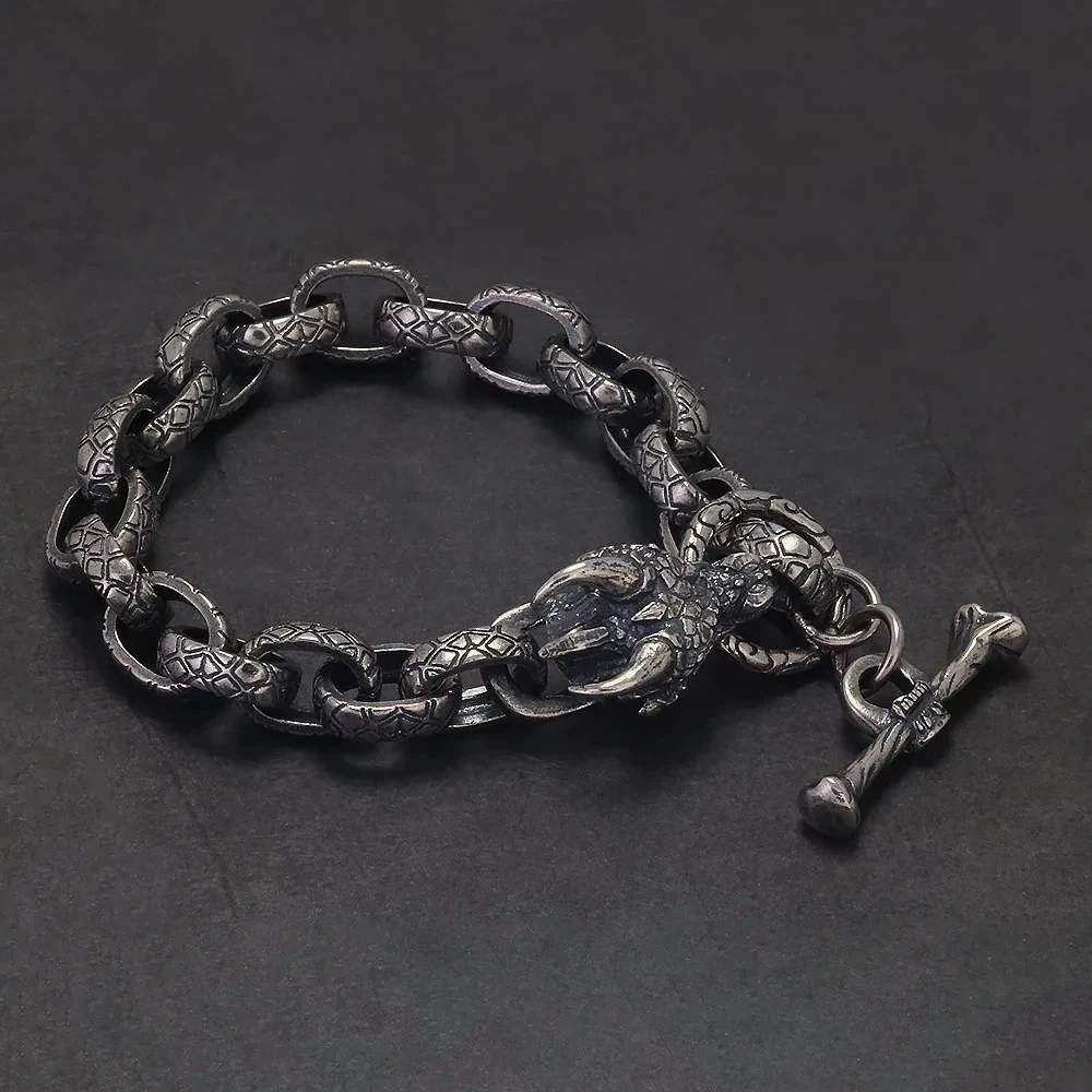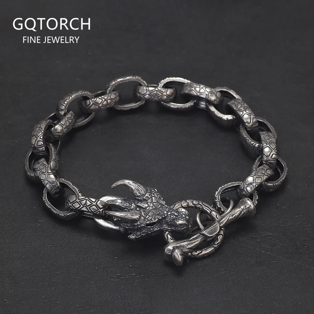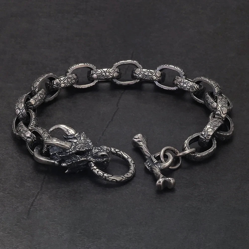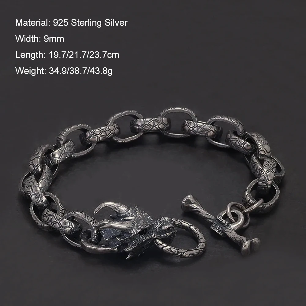 925 Sterling Silver Viking Dragon Head O-chain Bracelet for Men OT Buckle Antiqued Punk Retro Sturdy Handmade Birthday Jewelry