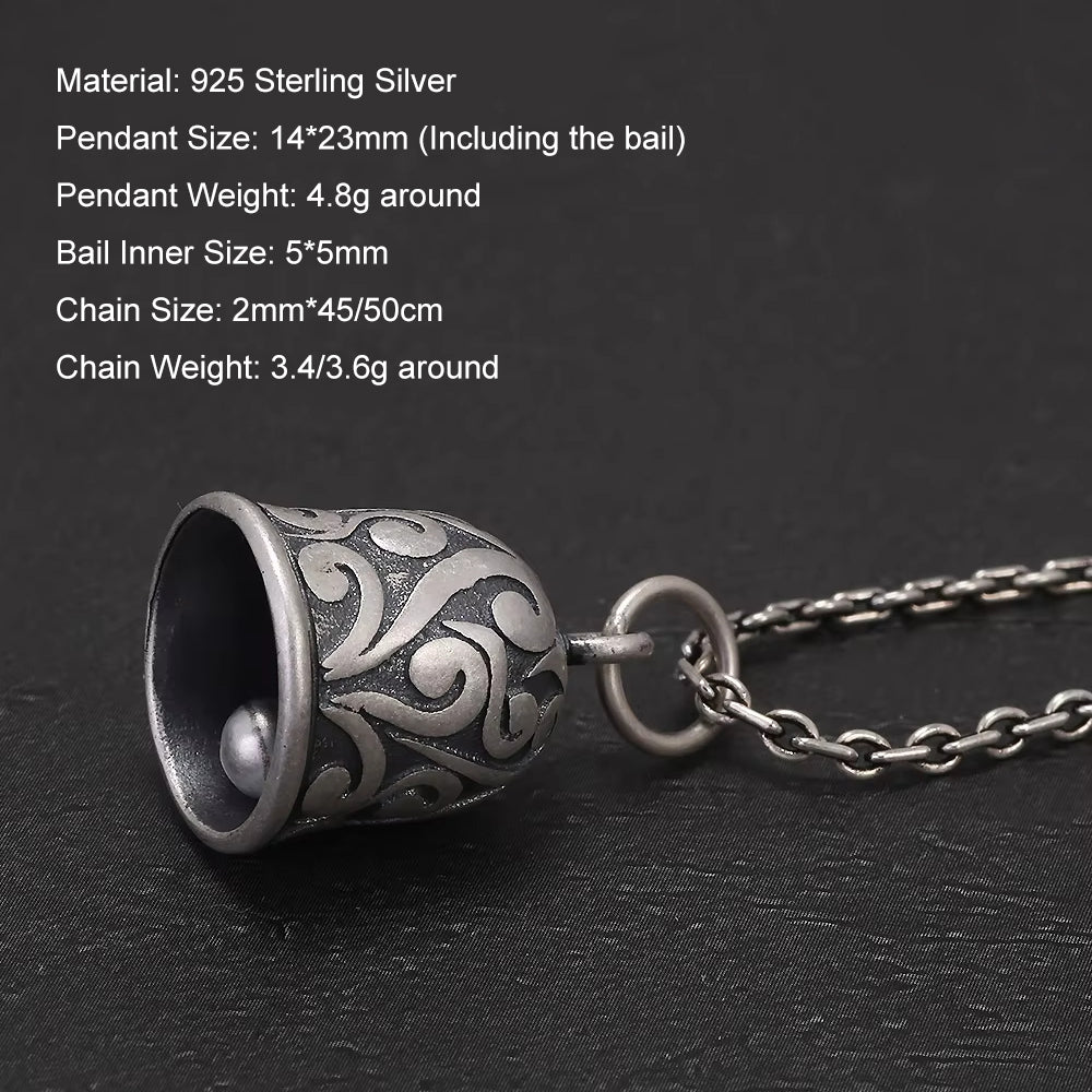 925 Sterling Silver Vintage Bell Pendant Necklace Tinkling Rattling Sound Matte Arabesque Pattern Unisex Charm Luck Jewelry Gift