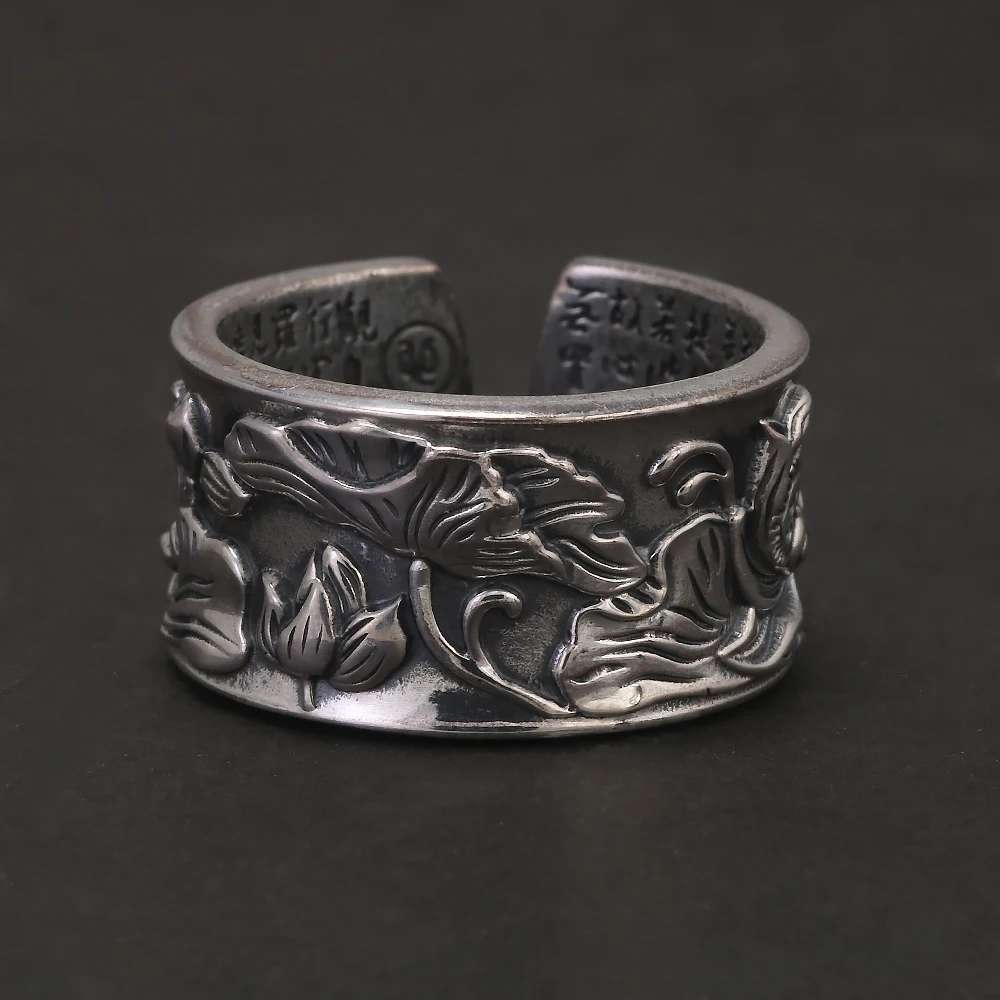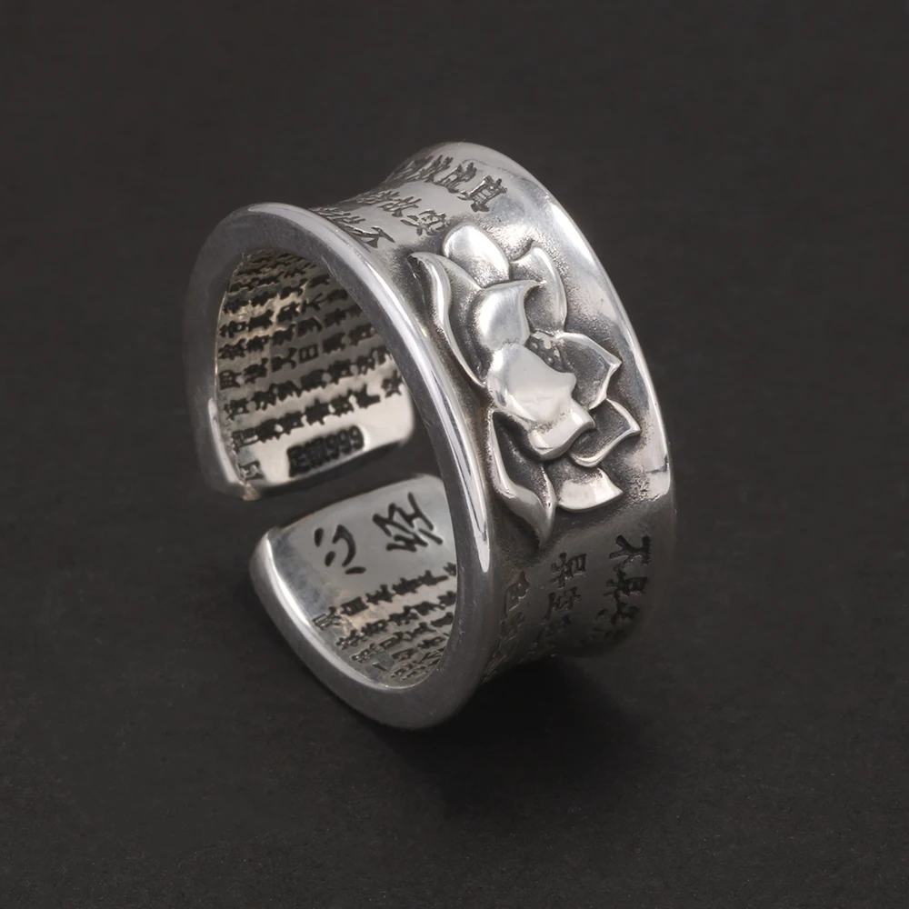 999 Pure Silver Lotus Ring Heart Sutra Engraved Adjustable Men Women Lucky Runes Vintage Retro Buddhism Jewelry