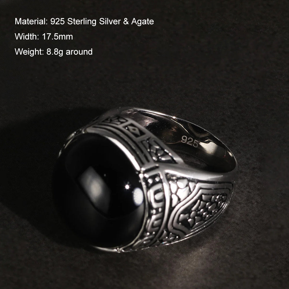 Real Pure 925 Silver Rings Cool Vintage Ring With Round Black Natural Stones Turkish Rings For Men Sterling Silver Jewelry